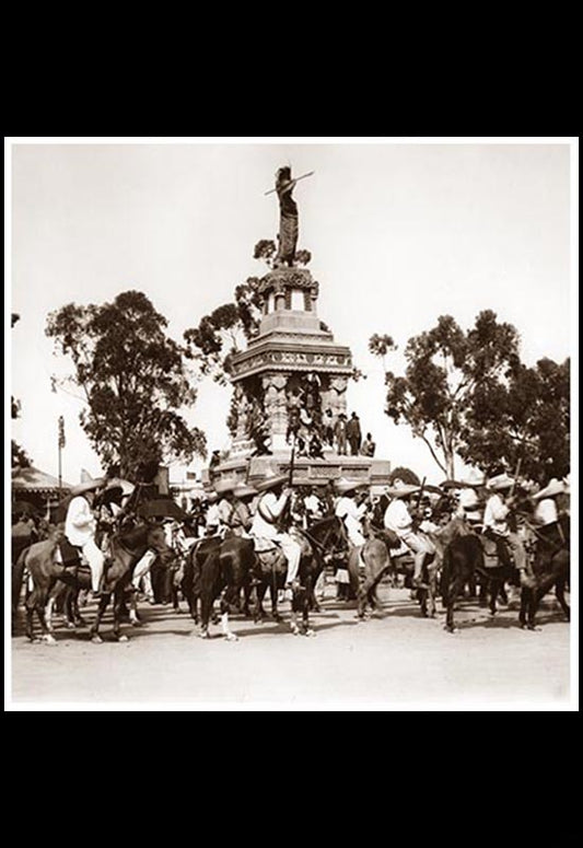 Zapatistas cabalgando frente al Monumento a Cuauhtémoc