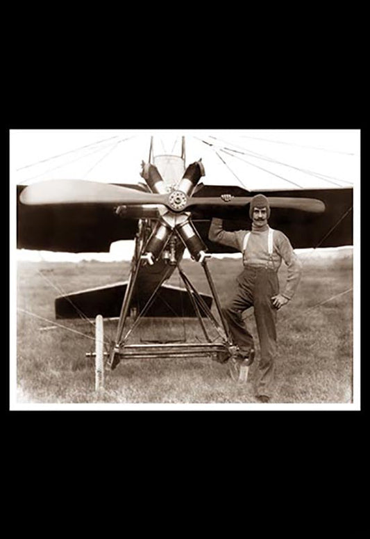 El aviador Miguel Lebrija posando frente a su aeroplano
