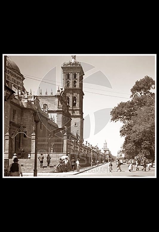 Vista general de la Catedral y El Palacio Municipal con kiosco en primer término