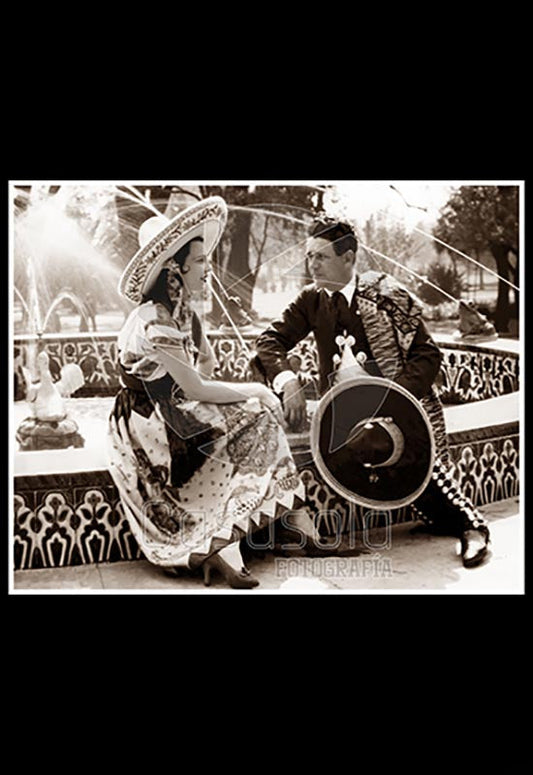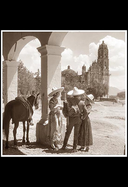 Iglesia de Tepozotlán con charro y chinas poblanas en primer término